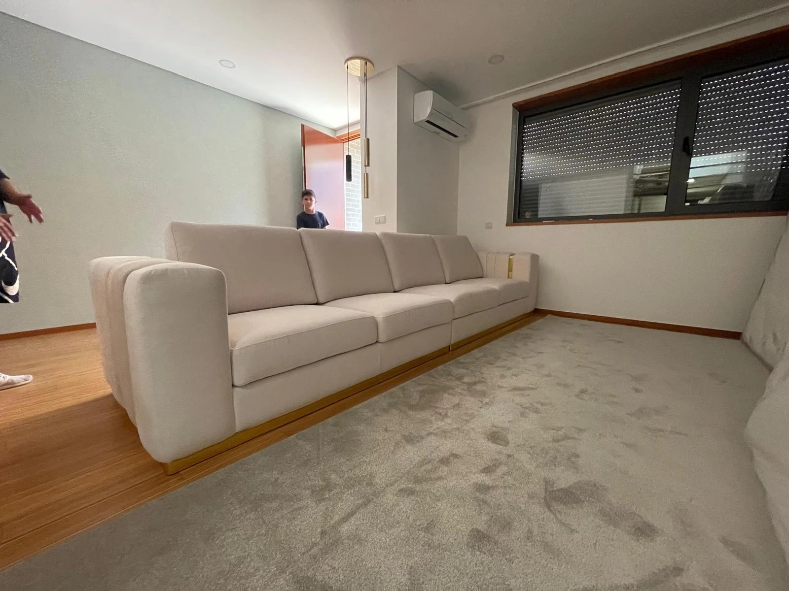 O design de sofá é moderno, espaçoso e de linhas retas, com um design elegante e minimalista. Ele é estofado em tecido de tom claro bege suave que dá ao ambiente uma sensação de leveza e conforto. Possui quatro lugares bem definidos, com assentos e encostos acolchoados, proporcionando bastante conforto.