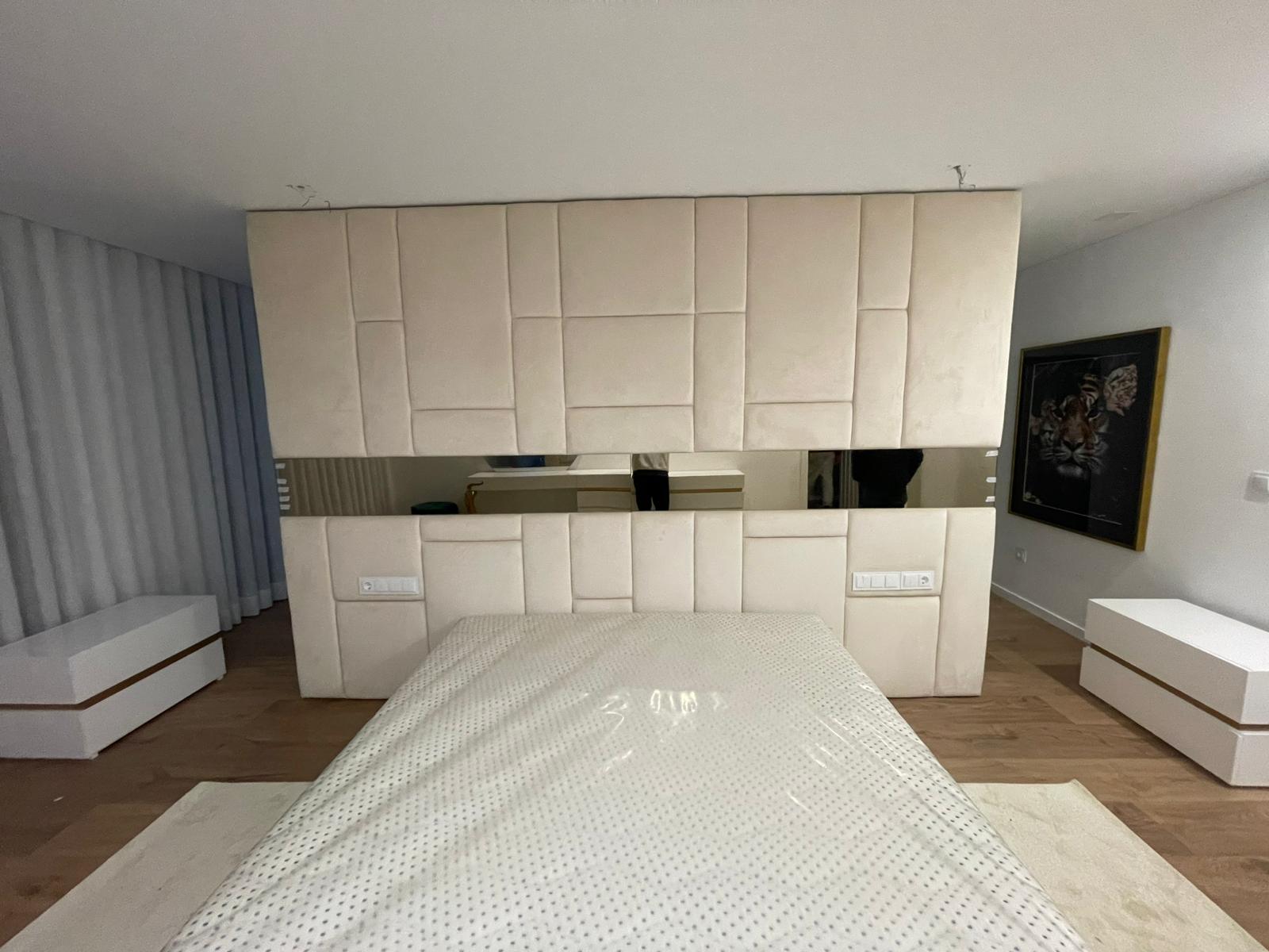 Este modelo possui uma cabeceira estofada grande, que ocupa praticamente toda a parede atrás da cama. O estofamento é feito em tecido aveludado ou suede, em um tom bege claro, proporcionando uma sensação de suavidade e elegância. A cabeceira tem um design geométrico, formada por painéis retangulares e quadrados de diferentes tamanhos, criando um efeito visual moderno e luxuoso.